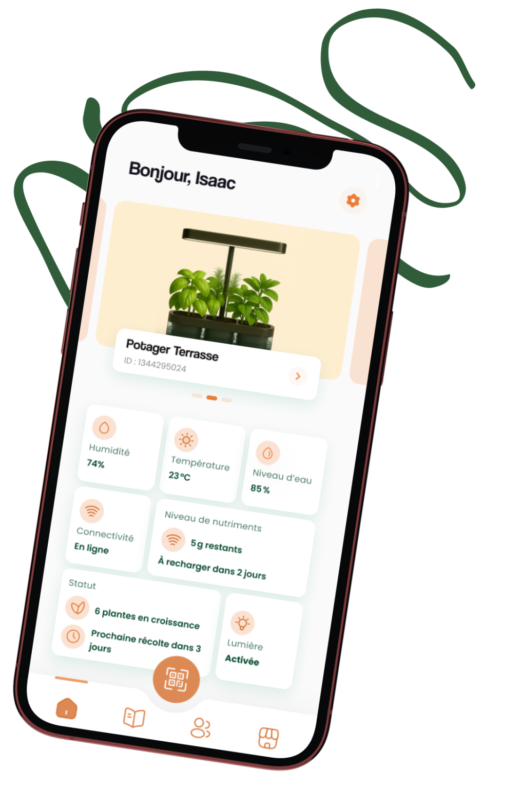 Grâce à l’application Cultive, pilotez facilement votre potager connecté intérieur depuis votre smartphone. Suivez en temps réel la croissance de vos plantes, recevez des conseils personnalisés et soyez alerté au bon moment pour arroser ou récolter.